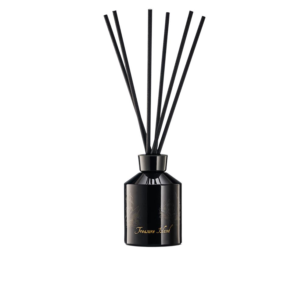 Butelka przedstawiona na zdjęciu to elegancki dyfuzor zapachowy marki Treasure Island. Jest wykonana z błyszczącego, lakierowanego szkła w intensywnym odcieniu głębokiej czerni, co nadaje jej luksusowy i tajemniczy charakter. Na froncie znajduje się subtelny, złoty napis „Treasure Island”, który podkreśla ekskluzywny wygląd produktu.