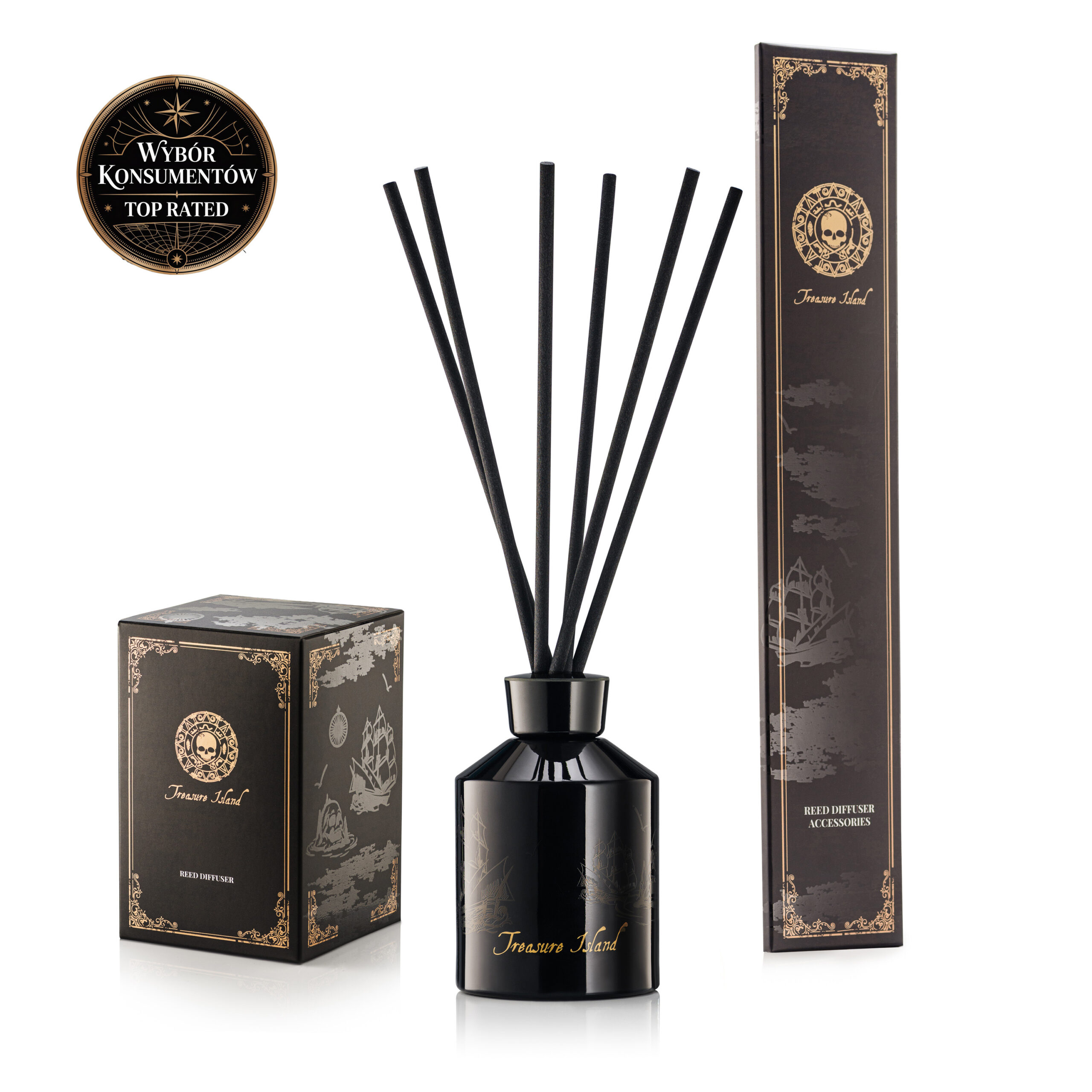 Dopełnieniem butelki są czarne patyczki, które efektownie kontrastują ze złotymi zdobieniami, potęgując wrażenie elegancji i wyrafinowanego stylu całości. Butelka dyfuzora Treasure Island to idealny wybór dla osób ceniących luksusowe dodatki oraz wyjątkową atmosferę wnętrza.